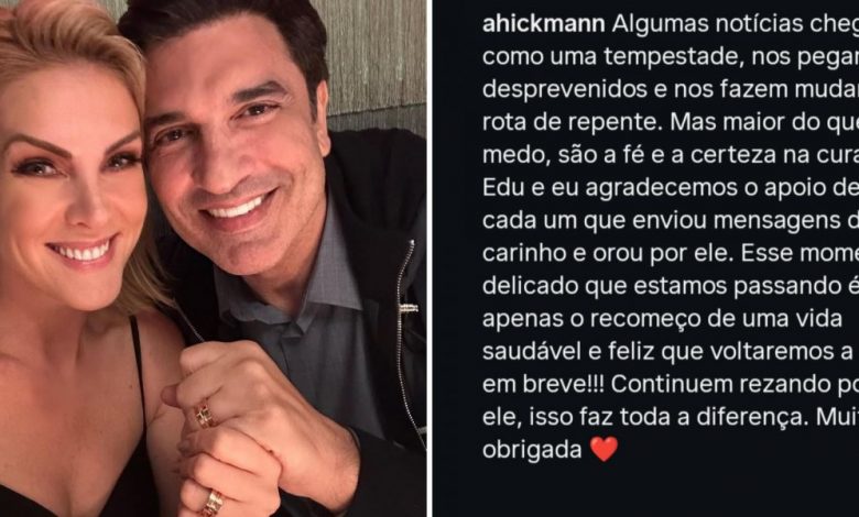 “Algumas notícias chegam como uma tempestade, nos pegam desprevenidos e nos fazem mudar a rota de repente. Mas maior do que o medo, são a fé e a certeza na cura. O Edu e eu agradecemos o apoio de cada um que enviou mensagens de carinho e orou por ele. Esse momento delicado que estamos passando é apenas o recomeço de uma vida saudável e feliz que voltaremos a viver em breve!!! Continuem rezando por ele, isso faz toda a diferença. Muito obrigada”, escreveu Ana.