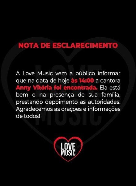 “A Love Music vem a público informar que na data de hoje às 14:00 a cantora Anny Vitória foi encontrada. Ela está bem e na presença de sua família, prestando depoimento às autoridades. Agradecemos as orações e informações de todos!”, informava o comunicado.