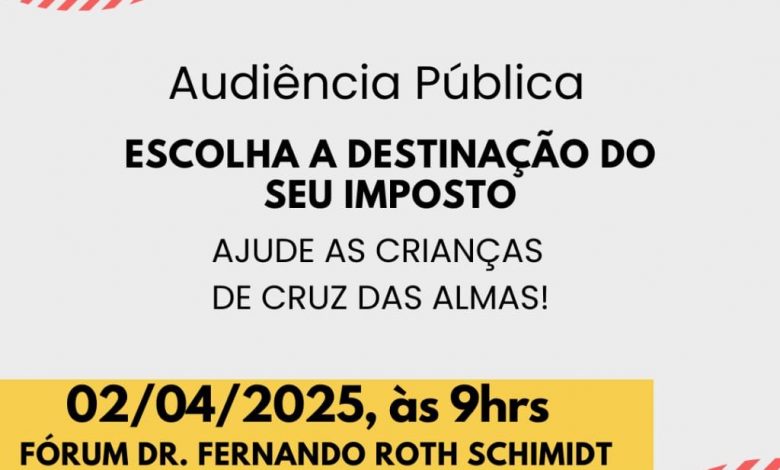 Na próxima quarta-feira (02), às 9h, será realizada uma audiência pública no Salão do Júri do Fórum Dr. Fernando Roth Schmidt, em Cruz das Almas, para debater a destinação de parte do Imposto de Renda de pessoas físicas e jurídicas ao Fundo Municipal para a Infância e Adolescência. A iniciativa, chamada de Imposto do Bem, visa incentivar contribuintes a direcionarem parte do imposto devido para financiar projetos sociais voltados à proteção, educação, saúde e capacitação de crianças e adolescentes no município, sem gerar custos adicionais.