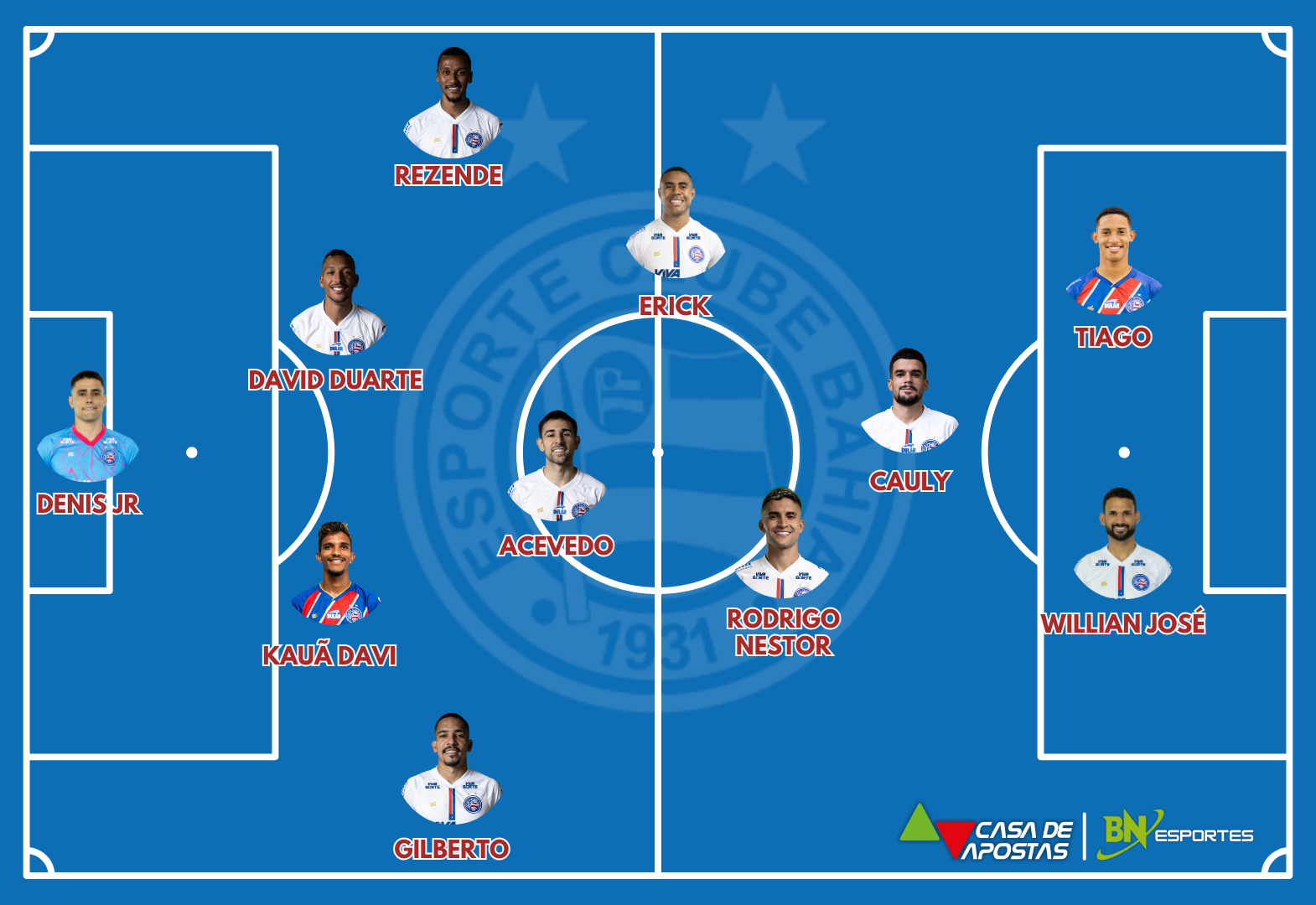 Bahia: Dênis Júnior, Gilberto, Kauã Davi, David Duarte e Rezende; Acevedo, Erick, Rodrigo Nestor e Cauly; Tiago e Willian José. Técnico: Rogério Ceni.