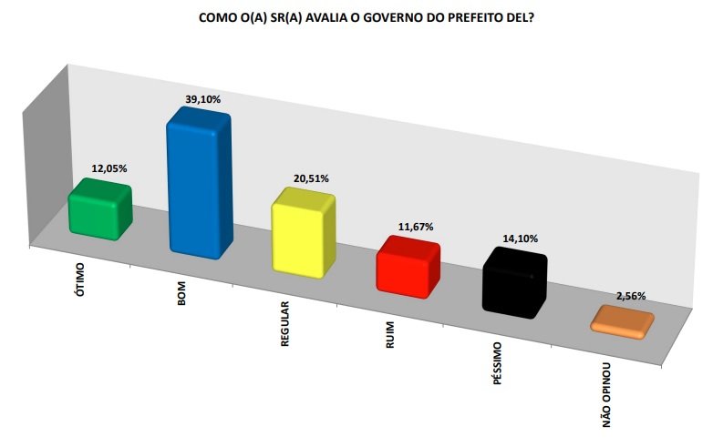 Divulgado nesta segunda-feira (6), o levantamento também fez uma avaliação do governo de Del, tomando opiniões do ótimo ao péssimo. Os que acham ótimo foram 12,05% e os que classificam como bom, 39,10%.
