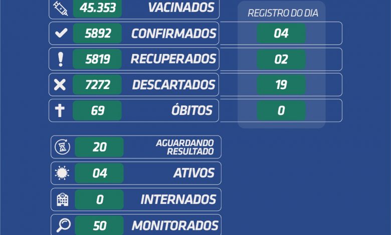 Foram registrados 04 novos casos de Coronavírus, nessa quinta-feira, dia 14 de outubro de 2021.