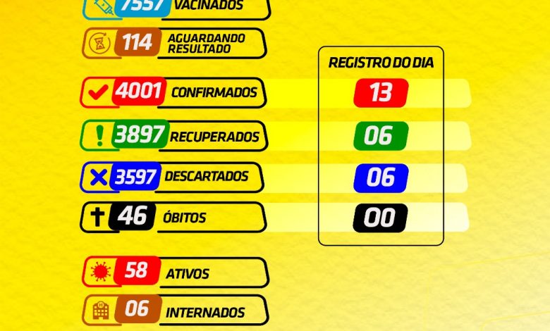 Foram confirmados 13 novos casos de Coronavírus e descartados 06 casos que aguardavam resultados, nesse domingo, dia 18 de abril de 2021.