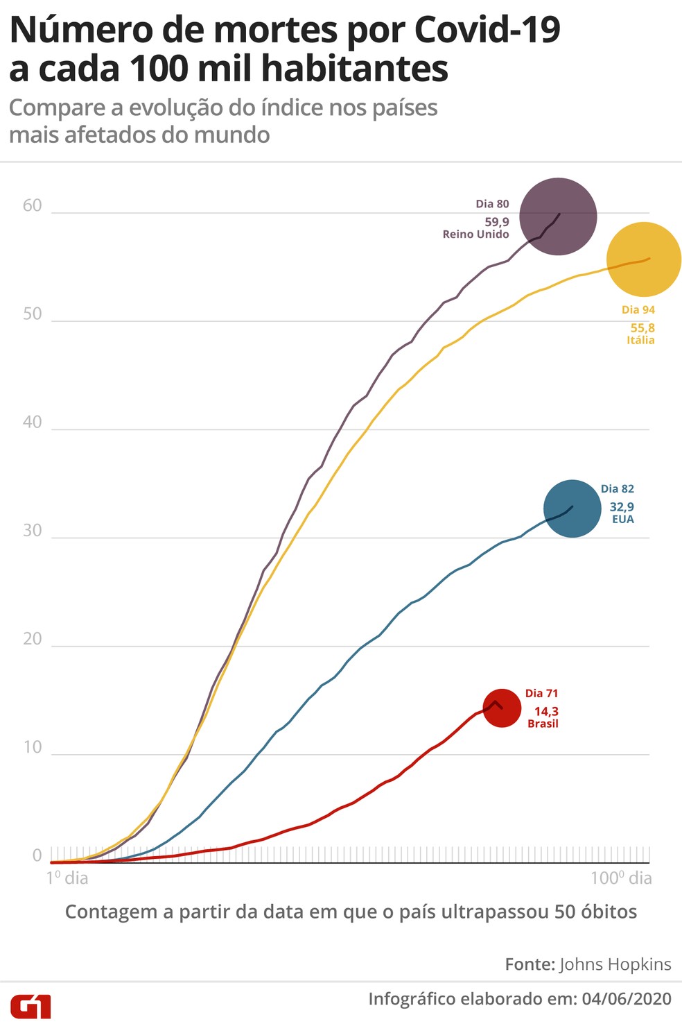 A taxa para cada 100 mil habitantes aponta que o Brasil tem 14 mortes a cada 100 mil. Essa taxa mostra o efeito do vírus em países menos populosos, como o Reino Unido (66,6 milhões) e a Itália (60,3 milhões de habitantes), em comparação com os EUA (329,5 milhões) e Brasil (209,5 milhões). (G1)
