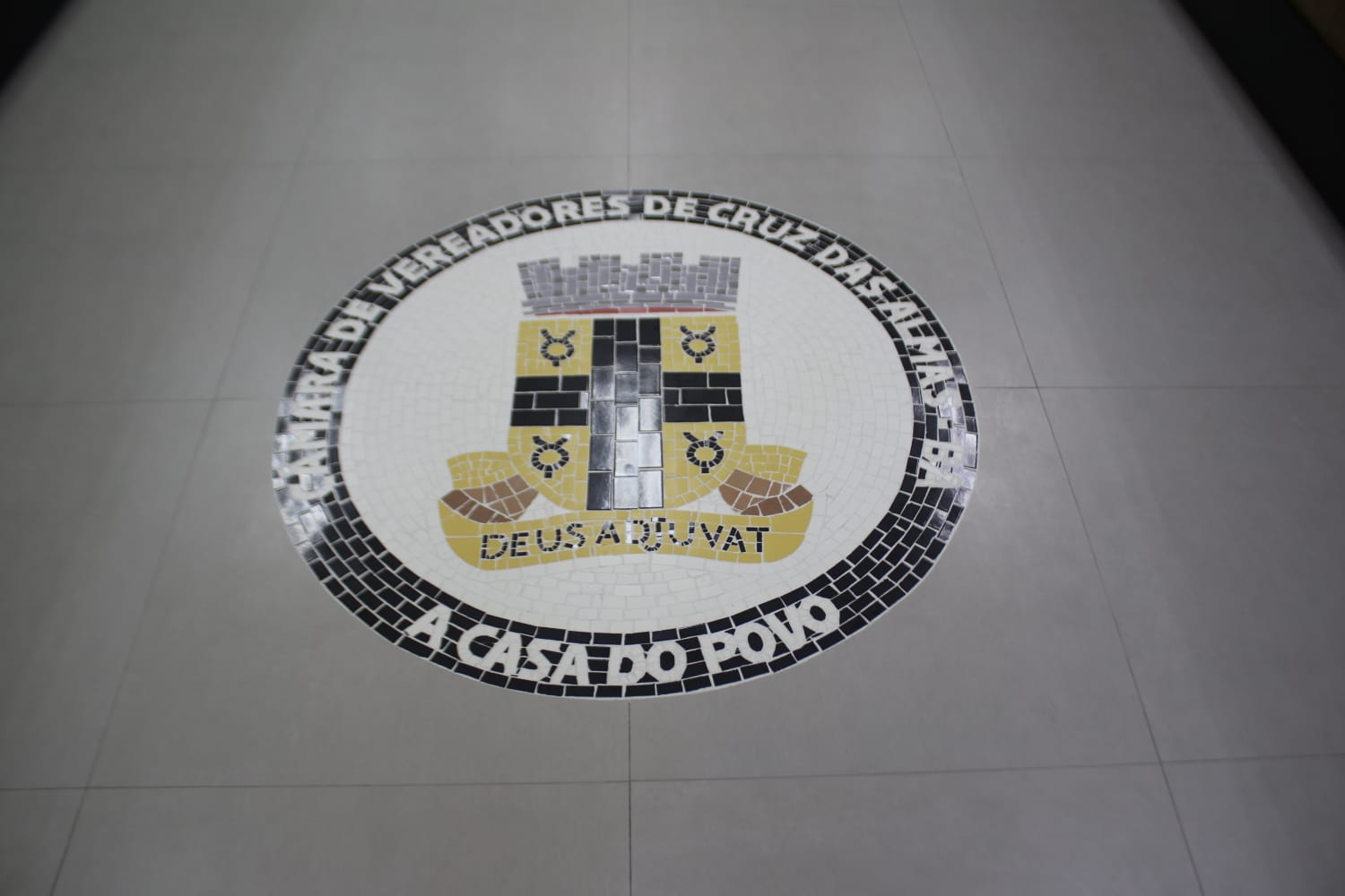 Uma das principais novidades da reforma é o belíssimo mosaico instalado no centro do plenário, apresentando o brasão oficial de Cruz das Almas. Elaborado com minucioso trabalho artístico, o mosaico fortalece o vínculo entre os vereadores e o povo que representam, reafirmando o compromisso de todos com o desenvolvimento e o bem-estar da população cruzalmense.