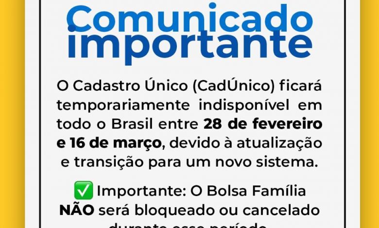 A Prefeitura de Cruz das Almas, através da Secretaria de Assistência Social, informa que o Sistema do Cadastro Único (CadÚnico) ficará temporariamente indisponível em todo o Brasil entre os dias 28 de fevereiro e 16 de março, devido a atualização e transição para um novo sistema, realizada pelo Governo Federal.