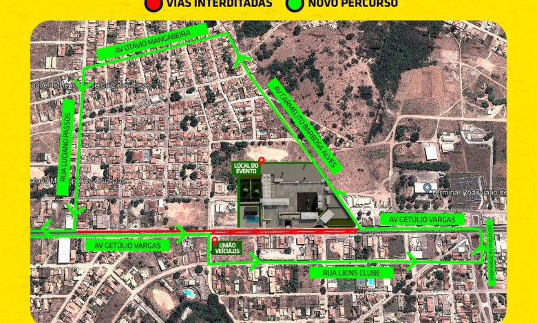 Entre os dias 20 e 25 de junho, a Avenida Getúlio Vargas, nas proximidades do Circuito Luiz Gonzaga, será parcialmente interditada das 18h às 6h. Durante este período, os motoristas que entrarem na cidade deverão utilizar o desvio ao lado da União Veículos, seguindo em direção à rotatória da Rodoviária. A partir desse ponto, terão três opções: virar à esquerda para acessar a entrada principal do Arraiá, virar à direita para acessar o centro da cidade, ou seguir em frente para a rodoviária.