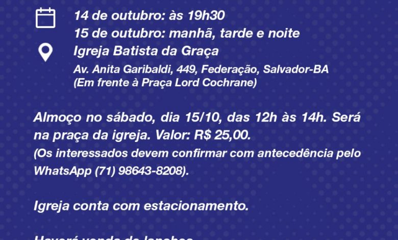 O evento gratuito ocorrerá na Igreja Batista da Graça em Salvador nos dias 14 e 15 de outubro de 2022. Preletores: Pr. Israel Belo, Pr. Erivaldo Barros e Pr. Geremias Bento.