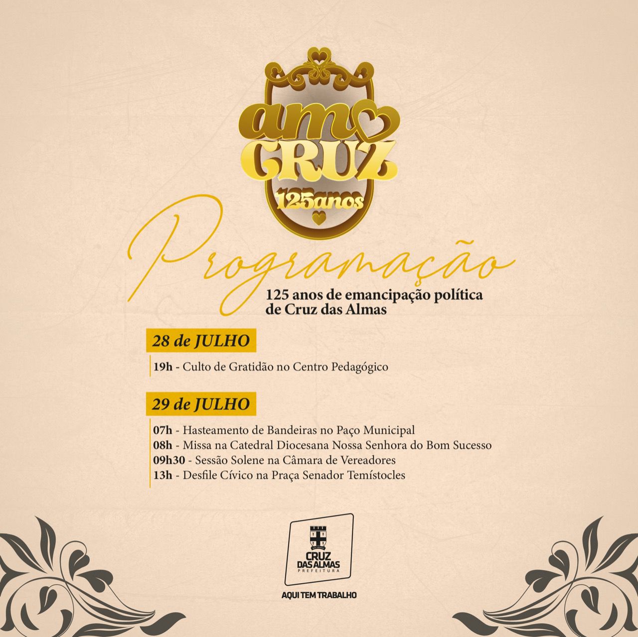 Na próxima sexta-feira, dia 29, a cidade de Cruz das Almas completa 125 anos de emancipação política e a Prefeitura preparou uma programação especial para a população cruzalmense.