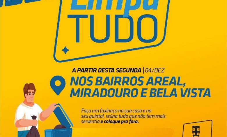 Os primeiros bairros que vão receber a operação são: Areal, Miradouro e Bela Vista. Se você é morador de alguma dessas localidades, separe os itens sem uso e coloque-os para fora. A equipe da SESP estará circulando pela região e recolhendo tudo o que for descartado. Esteja pronto para o grande “faxinaço”.