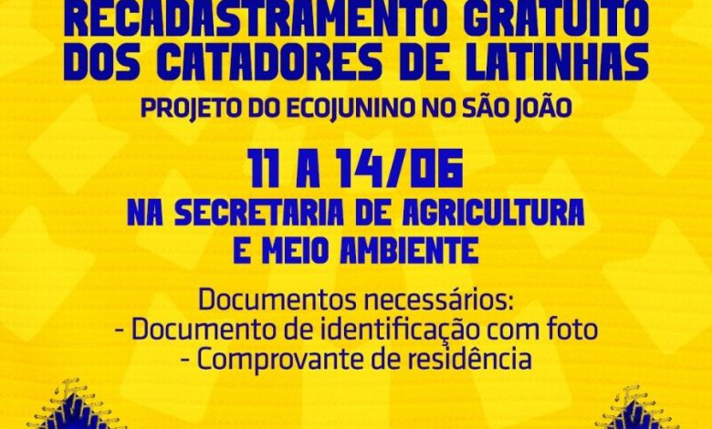 Para a realização do recadastramento, é necessário levar documento de identificação e comprovante de residência. A iniciativa tem o intuito de garantir que os catadores de latinhas estejam regularizados e possam desempenhar seu trabalho de forma organizada e segura durante o São João, contribuindo para um evento mais limpo e sustentável.
