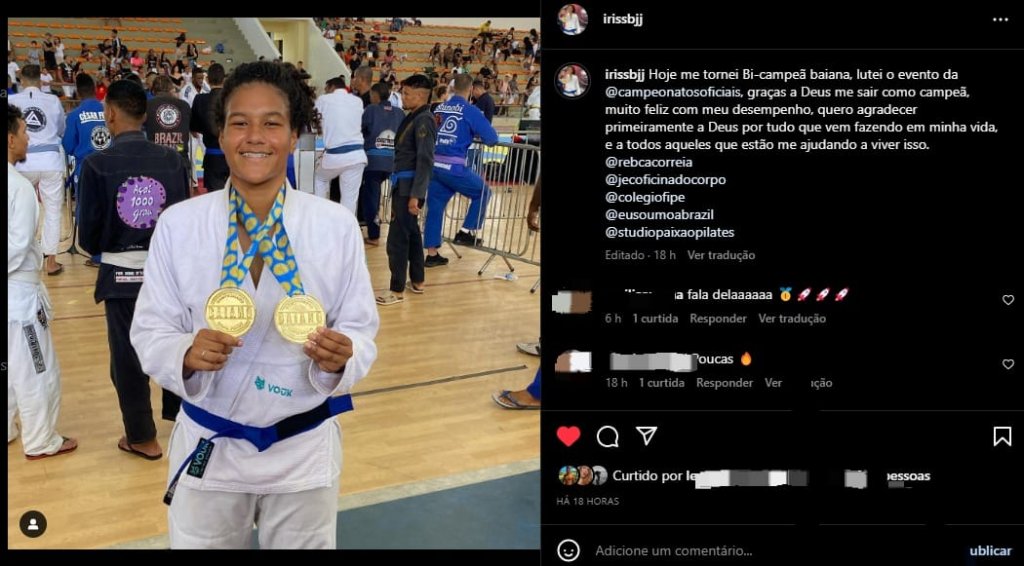 “No final do ano passado, disputei o mundial e me consagrei campeã da faixa azul, já no começo deste ano, eu me tornei bi-campeã baiana, mas agora em uma nova categoria”, contou Íris muito orgulhosa das últimas conquistas.