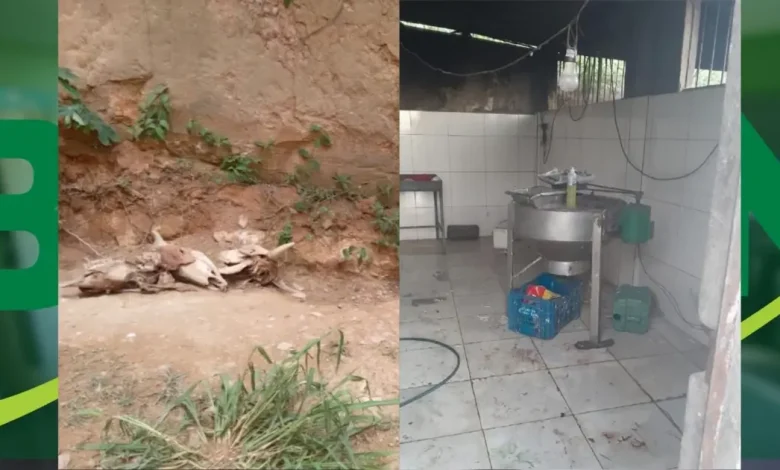 No local foram encontrados vestígios de abate clandestino de frangos, um caldeirão fervendo, um balde plástico com vísceras, uma estrutura de alvenaria contendo 62 aves vivas que provavelmente seriam abatidas, além de duas mesas sangradoras, uma máquina despenadeira e uma mesa de aço utilizadas para o abate de aves.