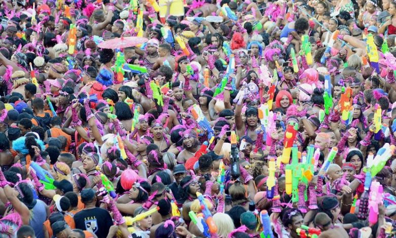 No registro, um grupo de homens travestidos usa pistolas de água para atacar as folionas.