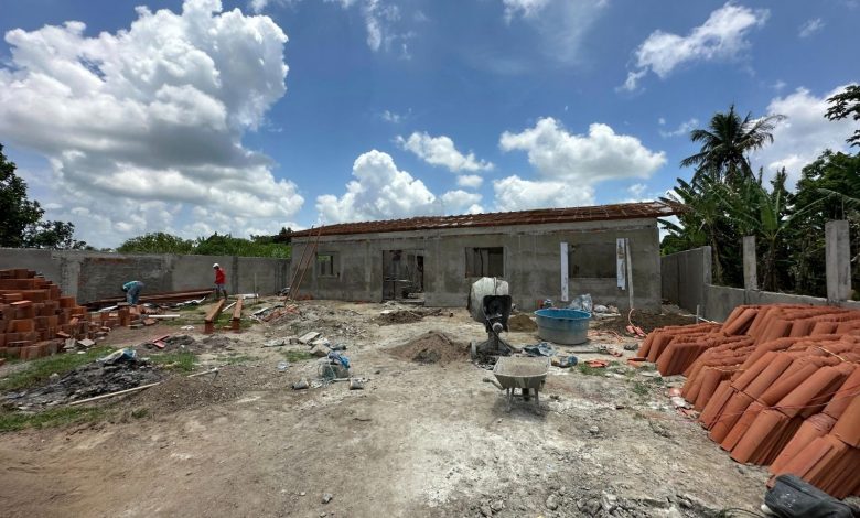 importante benefício para a comunidade local. A obra, executada com recursos próprios da Prefeitura de Cruz da Almas, já está na fase de telhamento e arestamento, seguindo para as etapas de instalação do forro, piso, portas e janelas.