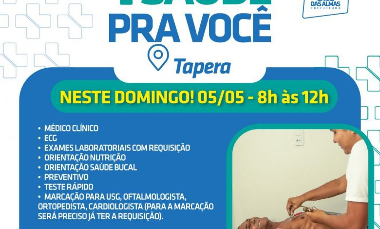 A Prefeitura de Cruz das Almas, por meio da Secretaria de Saúde, vai realizar neste domingo (5), mais uma edição do Projeto Mais Saúde Pra Você. Desta vez, os serviços de saúde serão ofertados para a população da comunidade da Tapera, no horário das 8h às 12h. Os atendimentos serão realizados através de senhas, que serão distribuídas no local.