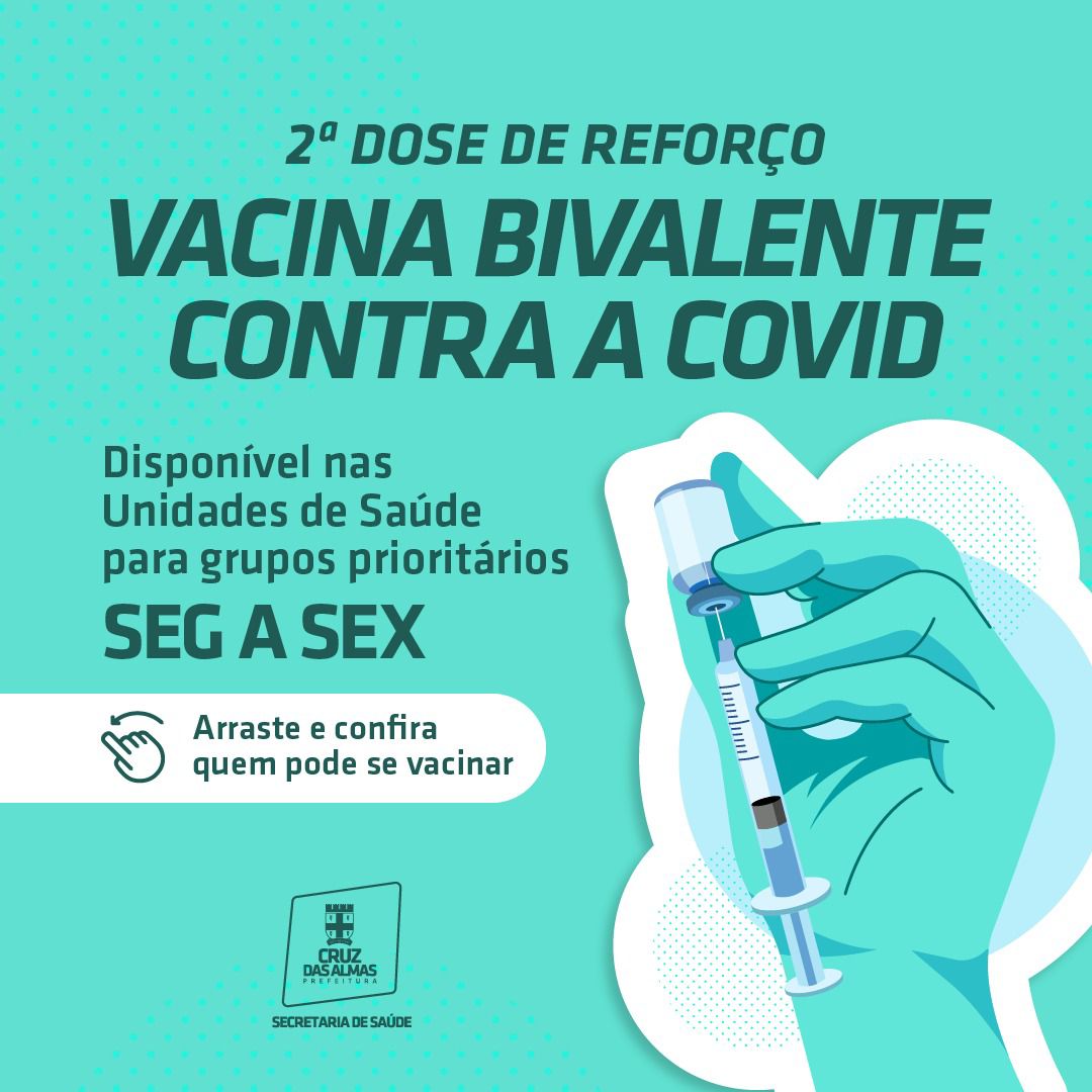 A Prefeitura de Cruz das Almas, através da Secretaria de Saúde, está realizando a aplicação da 2ª dose de reforço da vacina Bivalente contra COVID 19 para grupo prioritário.