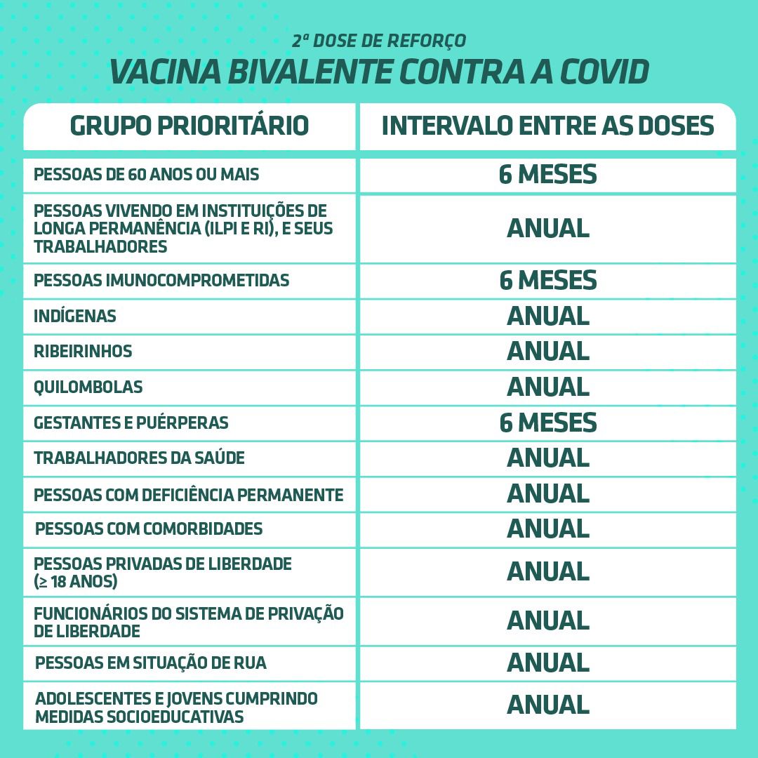 As doses estão sendo aplicadas nas Unidades de Saúde da Família, de segunda a sexta-feira, no horário de atendimento. Para idosos com 60 anos ou mais; gestantes; puérperas; e imunossupressos com 12 anos ou mais – é necessário ter um intervalo de 6 meses desde a última dose.