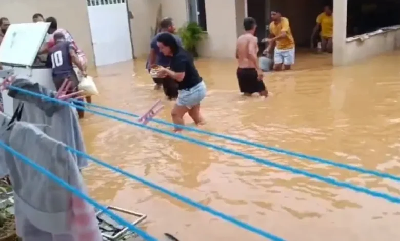 Rio transborda e alaga ruas em cidade do Baixo Sul do estado
