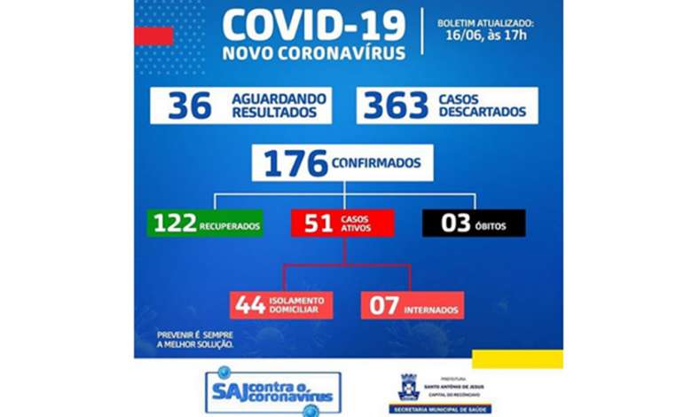 Até às 17h desta terça-feira (16), Santo Antônio de Jesus registra os seguintes números referentes a COVID-19 (novo coronavírus): • 51 (cinquenta e um) casos ativos, sendo 44 (quarenta e quatro) pacientes em isolamento domiciliar e 07 (sete) em internamento; • 122 (cento e vinte e dois) pacientes recuperados; • 03 (três) óbitos;