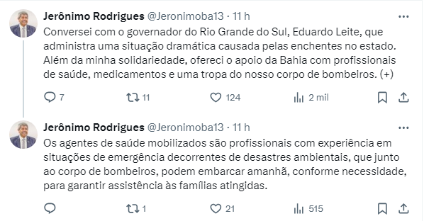 A solidariedade entre os estados não é novidade, já que Jerônimo e o governador do Rio Grande do Sul, Eduardo Leite, estabeleceram laços estreitos após trabalharem juntos em operações de resgate no passado. A ajuda mútua tornou-se uma marca de cooperação entre ambos os estados, sendo reiterada agora em meio à emergência causada pelo desastre natural.